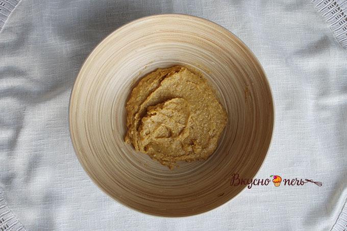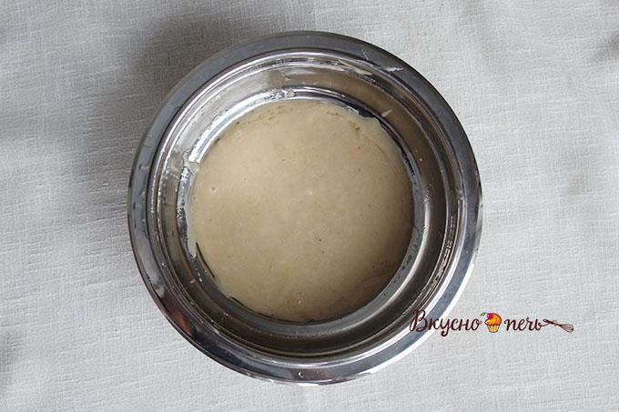 Добавить жидкую смесь к сухой. Перемешать лопаткой. Тесто получается густым.