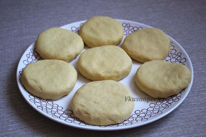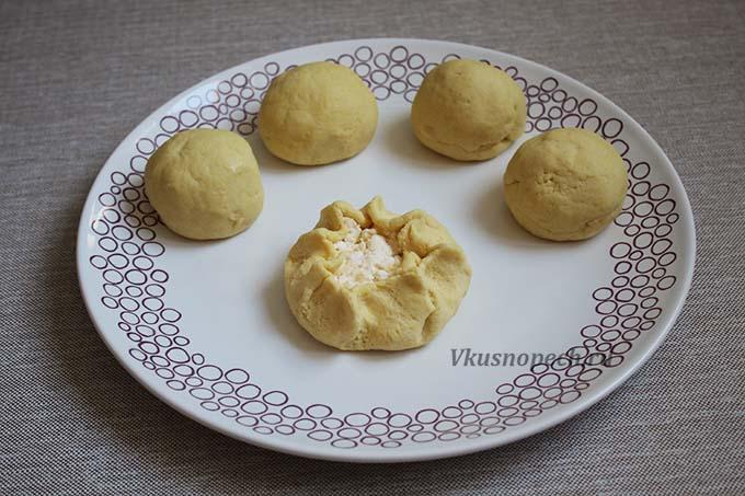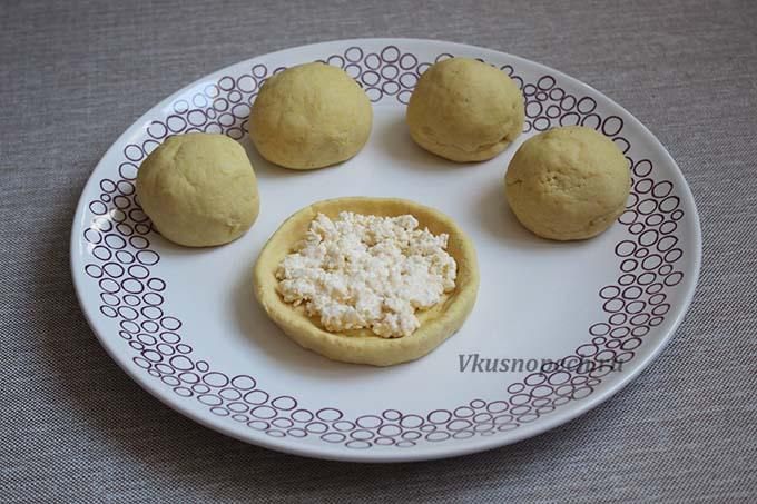 Готовое тесто делим на 9-10 частей. Из каждой формируем шар. Затем каждый шар разминаем в лепешку и наполняем начинкой, как показано на фото.