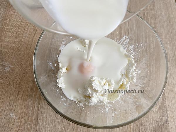 В глубокую емкость помещаем яйца, кефир, мягкий творог и подсластитель. Перемешиваем до однородности.
