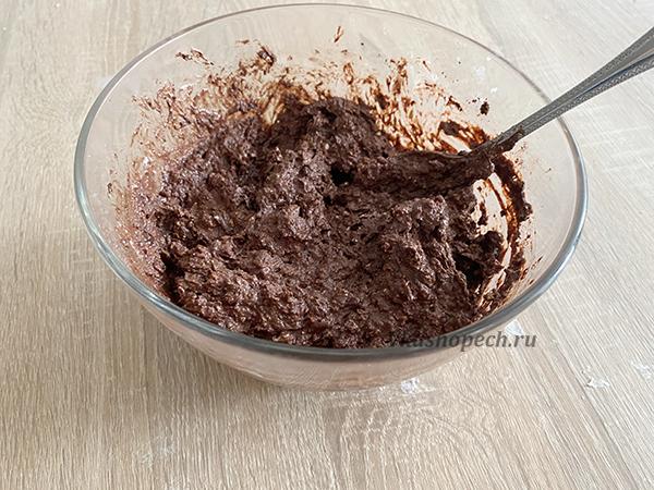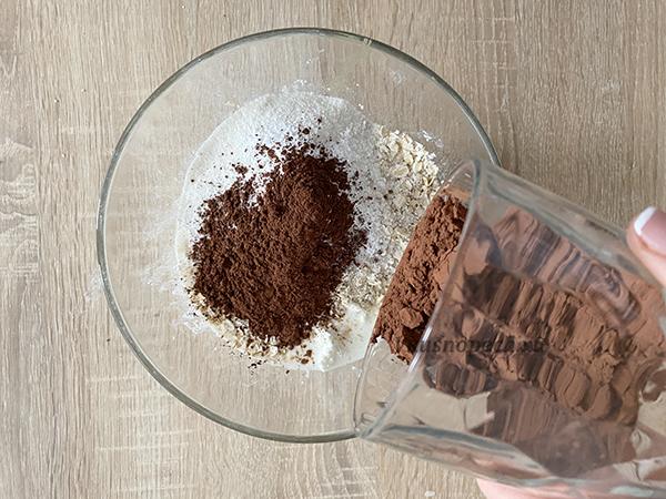В отдельной миске смешать все сухие ингредиенты: муку, овсяные хлопья (измельченные), какао порошок и разрыхлитель. Добавляем сухую смесь в общую массу. Тщательно перемешиваем.