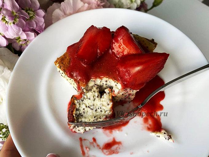Мак – опциональная добавка в данном случае. Можно спокойно обойтись и без него. Либо заменить чем-то другим. Прекрасно смогут дополнить вкус этой низкокалорийной творожной запеканки свежие фрукты и ягоды. При выборе, отдавайте предпочтение не водянистым фруктам. Например, малина, клубника, голубика. Однако, я бы рекомендовала лучше приготовить ягодный соус для творожной ПП запеканки, и украсить дополнительно свежими фруктами при подаче.