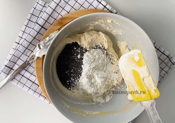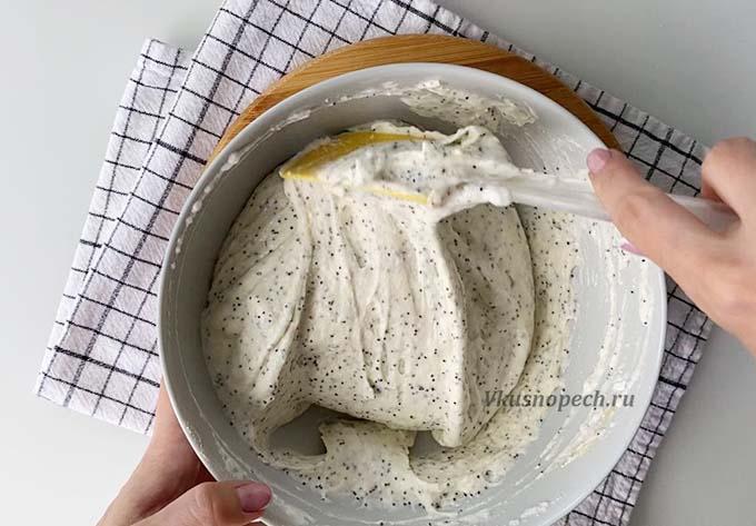 Добавляем сахарозаменитель, мак, йогурт и крахмал. Перемешиваем до однородности.
