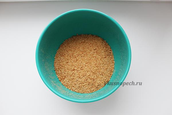 Первым делом измельчаем печенье в крошку. Можно сделать это при помощи блендара, либо вручную. Первый вариант конечно удобнее и быстрее.