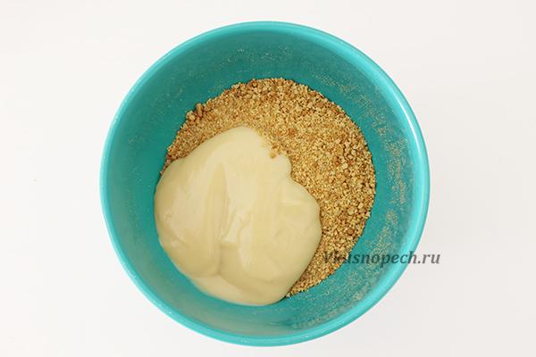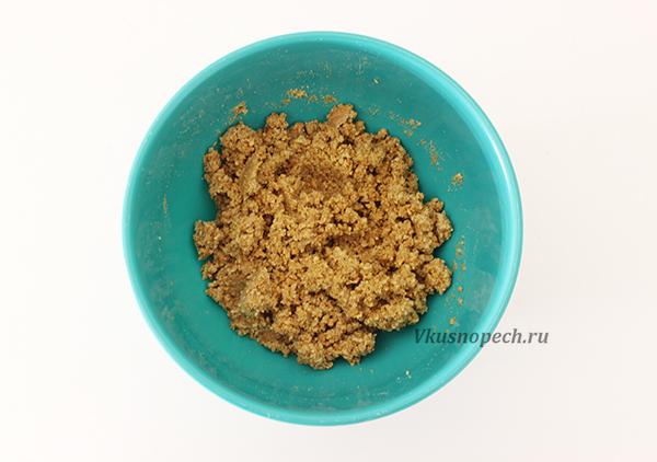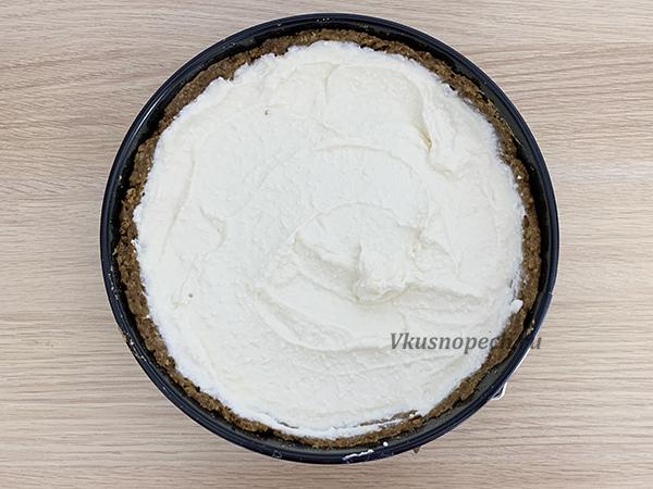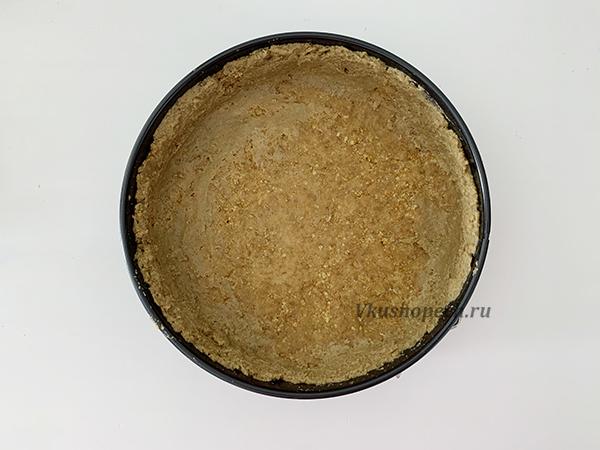Выкладываем пропитанную крошку в подготовленную форму для выпечки. Дном стакана придавливаем ее, формируя основу с бортиками. Не допускайте пробелов. Бортики должны быть плотными. Ставим на 5 минут в духовку, разогретую до 180 градусов.