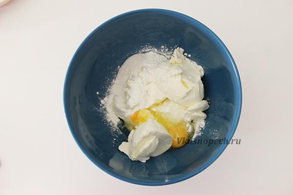 В глубокую посуду выкладываем творог, сливочный сыр, яйца, сахарозаменитель и крахмал. Тщательно взбиваем миксером.