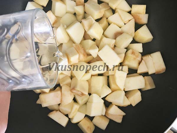 Первым делом необходимо подготовить фрукты: снимаем с них кожуру и нарезаем кубиками. Поливаем соком лимона. Перекладываем кубики в сотейник с толстым дном, или сковороду. Наливаем небольшое количество воды, накрываем крышкой и тушим около 5 минут.