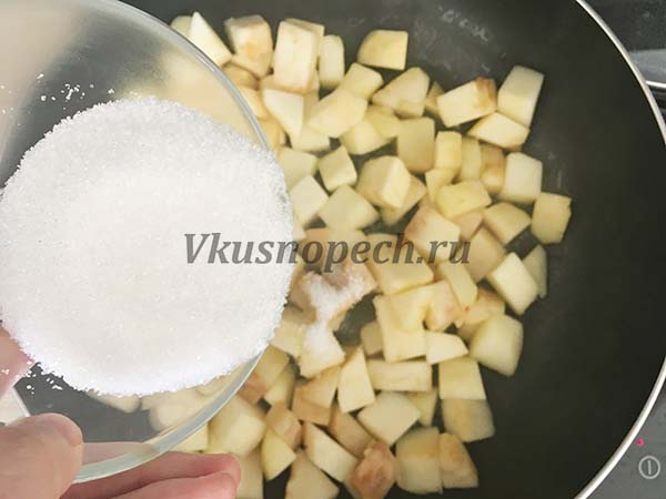 По истечению времени, отправляем к яблокам сахар. Хорошо размешиваем, чтобы он равномерно распредилился, и продолжаем тушить.