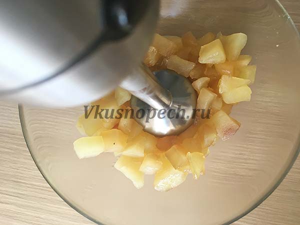 Когда кубики стали мягкими, перекладываем их в чистую емкость. Используя блендер превращаем их в пюре.