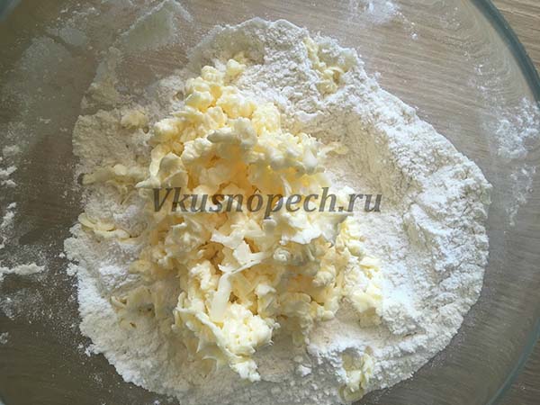 Просеянную муку смешиваем с разрыхлителем. Сюда же натираем на терке сливочное масло. Для этого оно должно быть очень холодным.