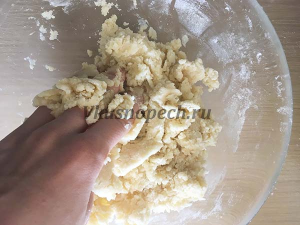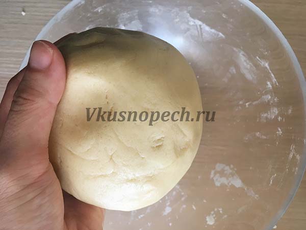 Быстро замешиваем тесто, до тех пор, пока оно не соберется в единый ком. Заворачиваем тесто в пищевую пленку и отправляем в холодильную камеру примерно на 1 час.