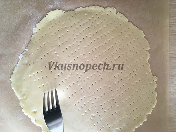 Делим шар на 5 равных частей. Каждую поочередно тонко раскатываем. Делать это рекомендуется прямо на пергаменте, слегка присыпанном мукой. Делаем частые проколы вилкой.