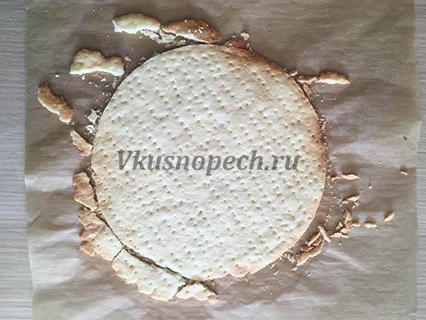 Выпекаем при 200 градусах около 8 минут. Достав из духовки, обрезаем края, не дожидаясь пока корж остынет.