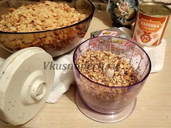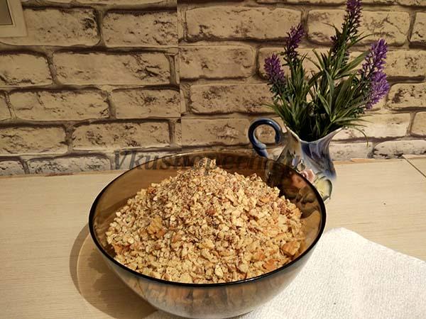 Отличным дополнением для торта без выпечки из печенья со сгущенкой станут орехи. Здесь также выбор за Вами. Я добавлю грецкие. Их также измельчаем.