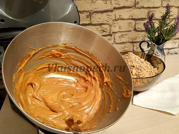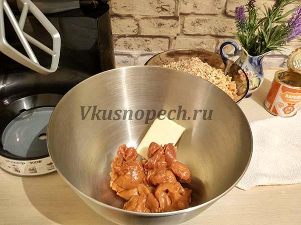 Для создания крема понадобится смешать варенное сгущенное молоко с размягченным маслом до однородной консистенции.