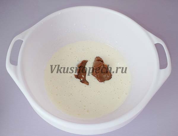 Когда масса станет пушной и побелеет, отправляем сюда же сгущенку.