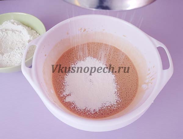 Муку смешать с разрыхлителем и просеять в основную массу.