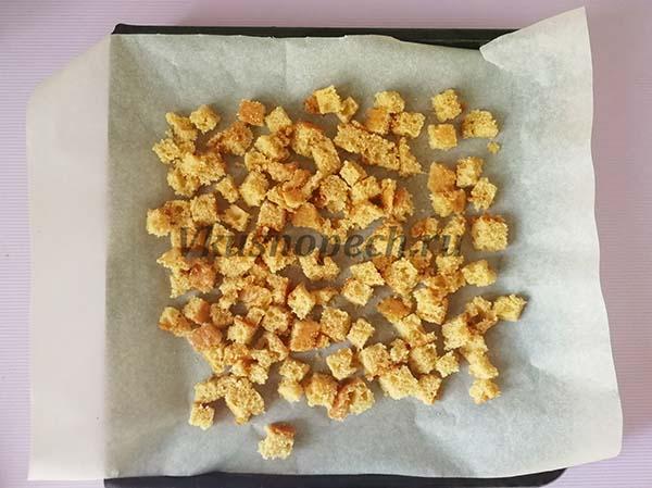 После того, как бисквит полностью остынет, делим его на 3 части, срезая “холмик”. Получившийся бугорок нарезаем кубиками и подсушиваем в духовке, чтобы получились сухарики. Их мы измельчим в крошку и будем использовать для декора.