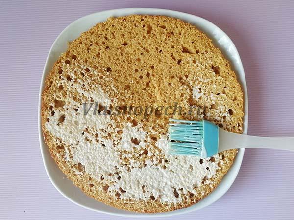 Переходим к сборке! Выкладываем на подложку (блюдо для торта) первый корж. Пропитываем сливками.