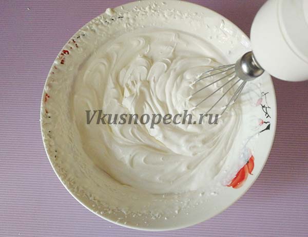 Для приготовления крема, в отдельной емкости взбиваем охлажденные сливки до “мягких пиков”.
