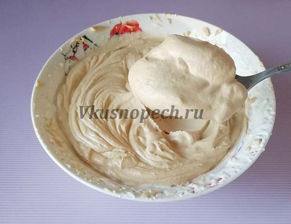 В сливки в несколько приемов добавляем сгущенку с маслом. Будьте осторожны, чтобы сливки не пере взбились. Можно на этом этапе убрать миксер и перемешивать лопаткой.