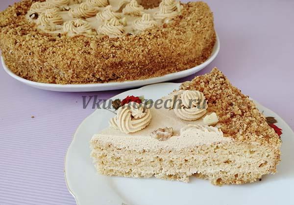 Тонкие пористые слои пышного румяного бисквита обладают не только аппетитным видом, но и стойким ароматом сгущенного молока. Нежнейший крем состоит из вареной сгущенки, взбитых сливок и сливочного масла. Такое ассорти сливочно-молочных вкусов придает десерту собственный изумительный вкус. Интересные нотки добавляют измельченные грецкие орешки. Их пряный привкус придает контрастности, делая вкусовую гамму ярче.