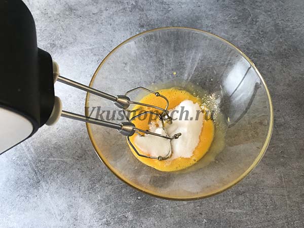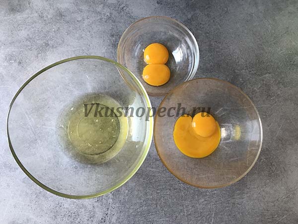 От общей массы сахара откладываем 1 столовую ложку для добавления к белкам. Остаток взбиваем с двумя желтками.