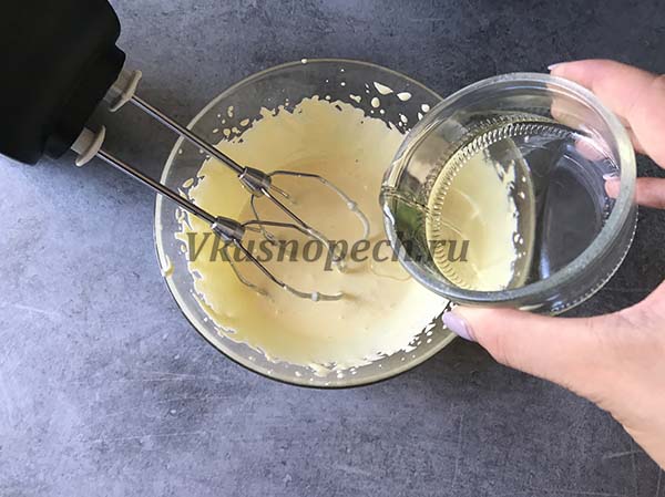 Когда масса побелеет, добавляем растительное масло. Делать это необходимо небольшими частями.