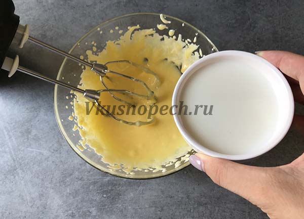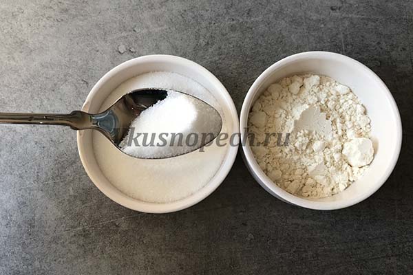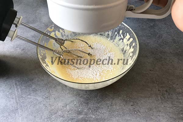 Половину сахара смешиваем с мукой и добавляем к желткам.