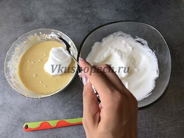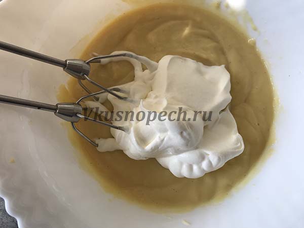 Взбиваем белки с щепоткой соли. Когда появится плотная пенка, добавляем сахар, добиваемся крепких пиков, и, небольшими порциями, вмешиваем в тесто.