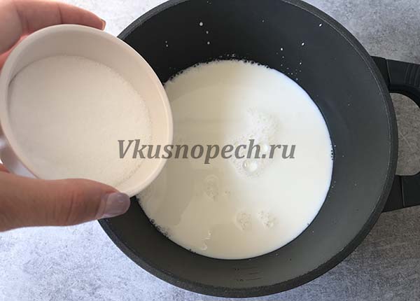 В кастрюлю с толстым дном переливаем молоко и добавляем остаток сахара. Хорошо прогреваем, но не кипятим.