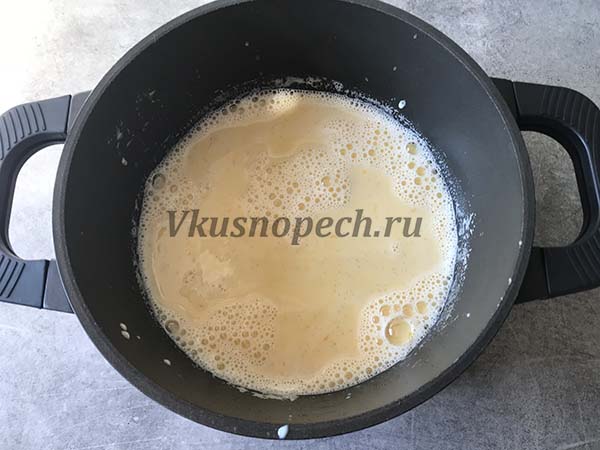 Горячее молоко очень тонкой струйкой вводим в желтковую массу, постоянно размешивая ее венчиком. Полученную массу переливаем обратно в кастрюлю и отправляем на плиту.