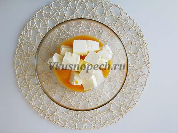 Отделяем белки от желтков (яйца берем охлажденные). Белки ставим обратно в холодильник, а желтки отправляем в отдельную глубокую посуду. Туда же добавляем мягкое сливочное масло, сахар, и, вооружившись миксером, взбиваем до однородности.