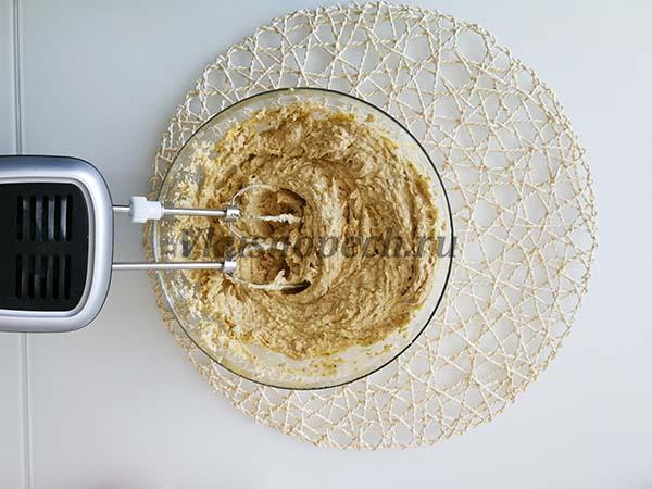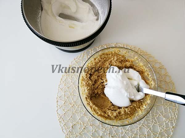 Белки взбиваем на небольших оборотах. Когда они превратились в воздушную пену, начинаем подсыпать сахарную пудру. Взбиваем до крепких пиков. Взбитые белки аккуратно вводим в тесто, перемешивая лопаткой снизу вверх.