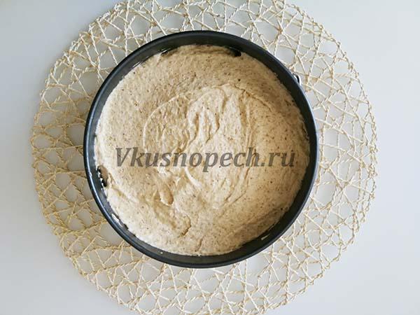 Дно формы для выпечки обязательно застелите пергаментом. После чего, переложите туда получившееся воздушное тесто.