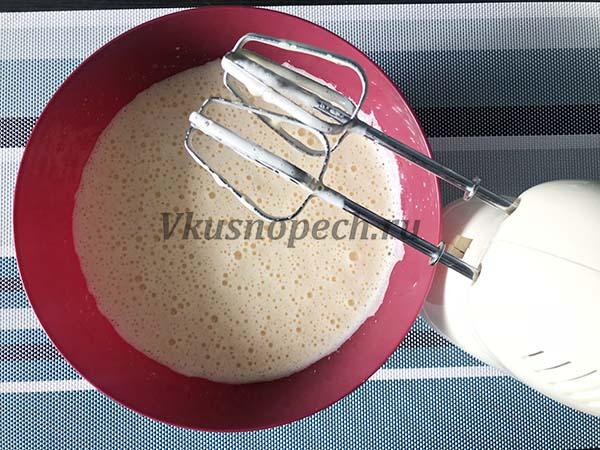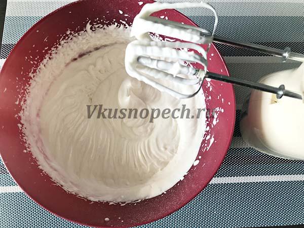 Взбиваем сначала на небольших оборотах, затем начинаем подсыпать пудру и увеличиваем скорость. Продолжаем работу пока сливки не загустеют.