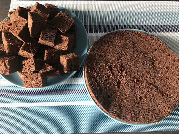 Остывший бисквит разрезаем так, чтобы высота нижнего коржа была около одного сантиметра. Из оставшегося бисквита делаем кубики, используя острый нож.