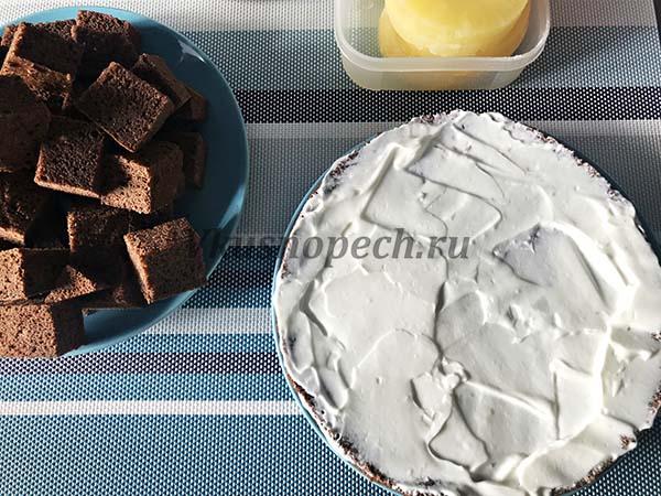 Следующий слой будет состоять из кубиков, каждый из которых следует окунуть в сливочный крем.