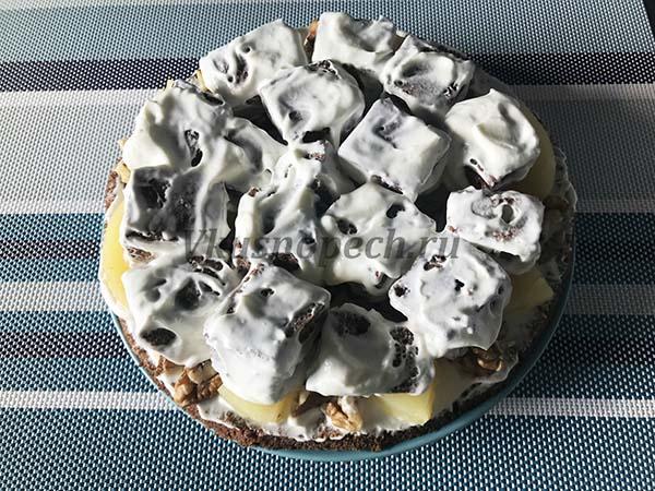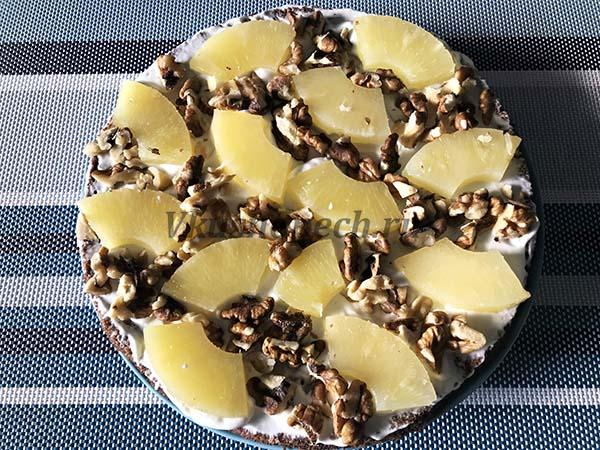 Сверху выкладываем ананасы и орехи.