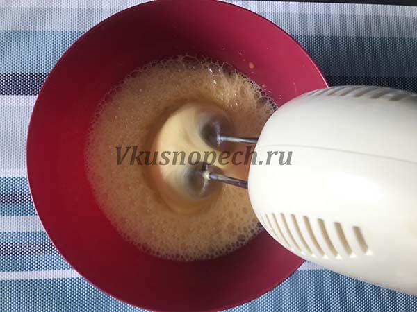 Начинаем работать миксером на малых оборотах. Через 1 минуту увеличиваем скорость и взбиваем еще 5 минут. Затем по несколько ложек начинаем подсыпать сахарный песок. В общей сложности процесс приготовления яично-сахарной массы у вас займет около 10 минут.