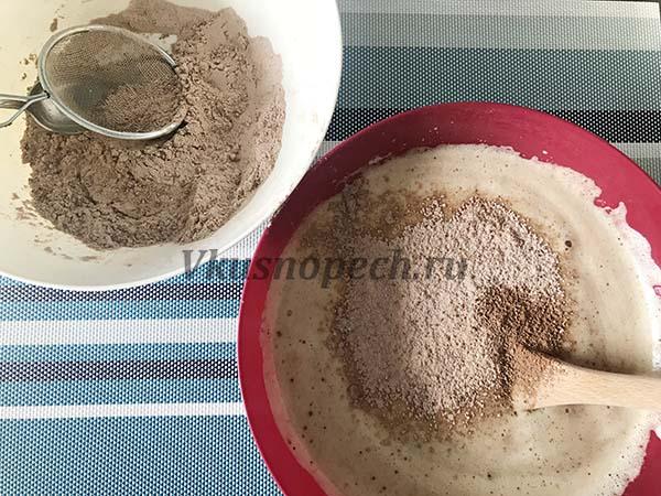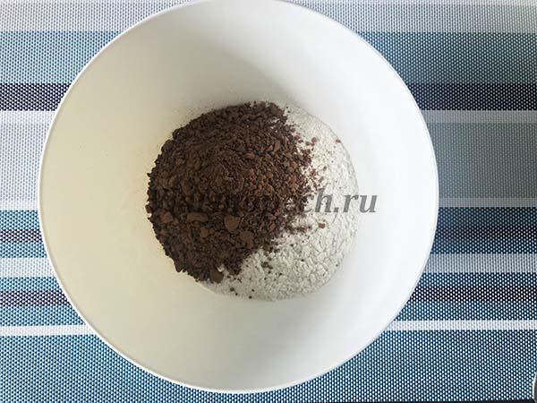 В чистой глубокой миске необходимо соединить сухие ингредиенты: мука, разрыхлитель, какао.
