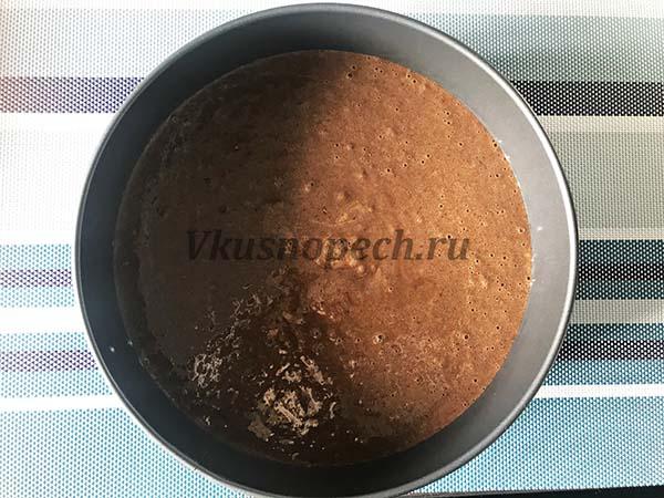 Перемещаем тесто в подготовленную форму и ставим в духовой шкаф. В то время, как оно будет находиться в духовке, дверцу открывать не следует, этим вы можете спровоцировать оседание коржа.