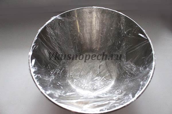 Необходимо подготовить форму для будущего десерта. Для этого берем глубокую миску, выстилаем ее пищевой пленкой. Края пленки должны свисать.