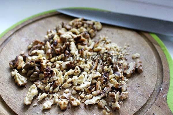 Подготавливаем орешки: перебираем, отсортируем горькие и испорченные, проверяем на наличие осколков скорлупы, обжариваем в духовом шкафу или на сковороде до приятного румянца, легкого аромата. Рубим крупной крошкой посредством кухонного ножа.