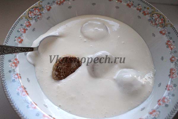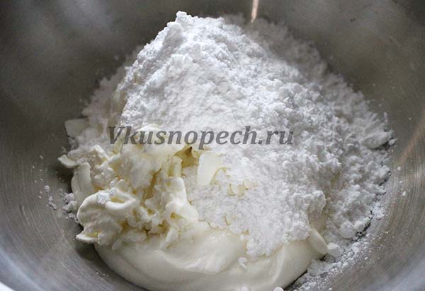 Отдельную емкость заполняем холодной сметаной. Туда же отправляем пудру. Взбиваем при помощи миксера на самой максимальной скорости до получения легкого, воздушного крема.