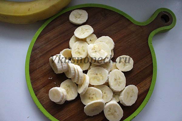 Переходим к бананам: чистим, режем очень тонкими кружочками. Заранее этого делать не стоит, потемнеют.