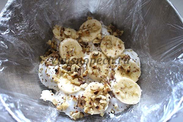 Выкладываем ими нижний слой в миске. Сверху часть банановых кругляшек. Потом небольшой слой орешков.
