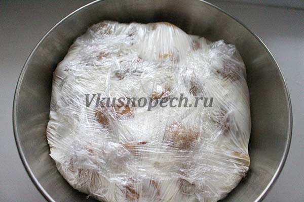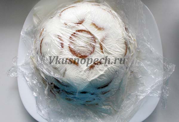 Разворачиваем края пленки, накрываем плоской тарелкой или подносом, переворачиваем «вверх ногами», снимаем миску, аккуратно удаляем полиэтилен.