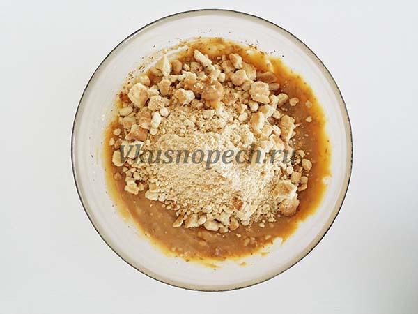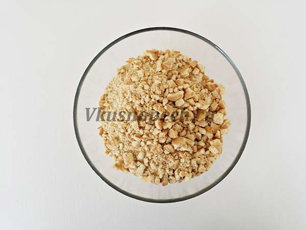 Механическим путем (разламывая руками) превращаем печенье в крошку. Возможен любой вариант, который хорошо крошится. Например, « Привет», «Сахарное», « К чаю». Величина кусочков может различаться. Это принесет блюду еще больше шарма.