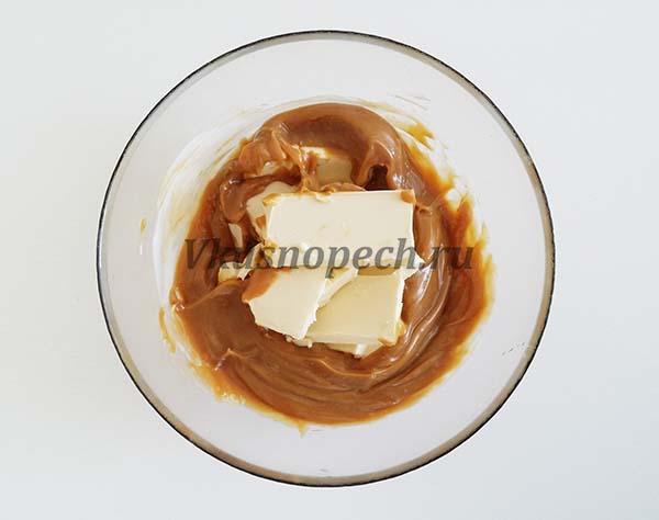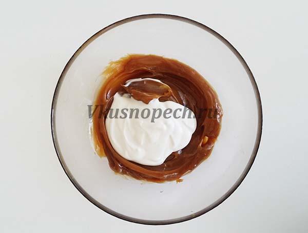 В отдельной посуде взбиваем сгущенку посредством миксера. Добавляем во взбитую массу сметану и продолжаем взбивать.