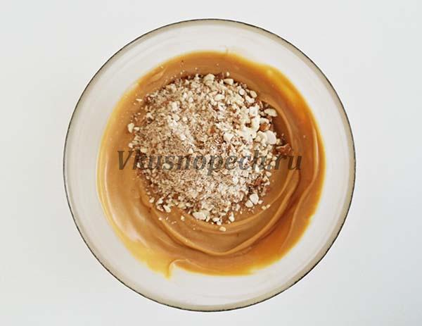 Дополняем сладкую пасту орешками. Можно взять ассорти – грецкие, кешью и фундук. Я использую миндаль.
